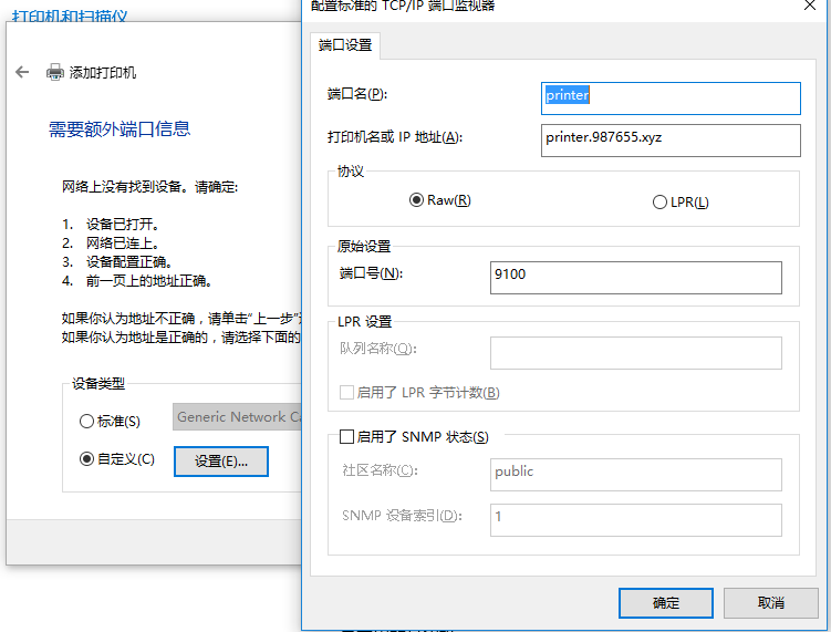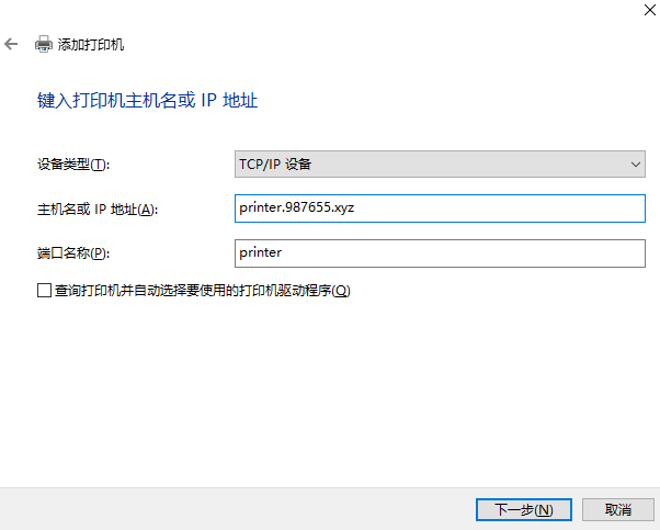 4. 主机名填printer.987655.xyz,端口printer,去掉下面的勾